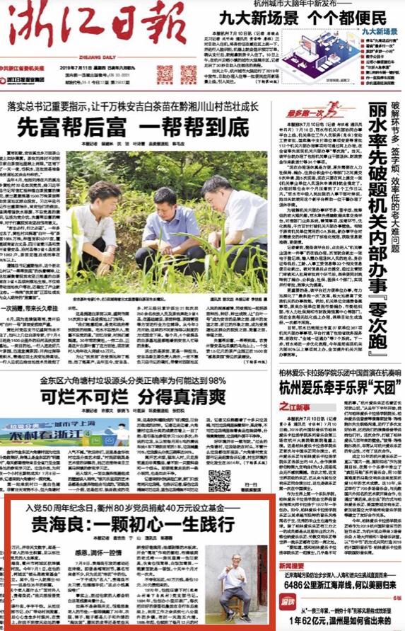 贵海良,衢州市柯城区航埠镇新山村村民。今年7月1日,在他的倡议下,柯城区“领头雁教育基金”正式成立。其中,他一人就捐出40万元钱——这是他35年的积蓄。