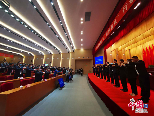 ▲常山县委书记叶美峰带领县四套班子领导、五位“有礼常山”形象大使与代表委员一同行作揖礼