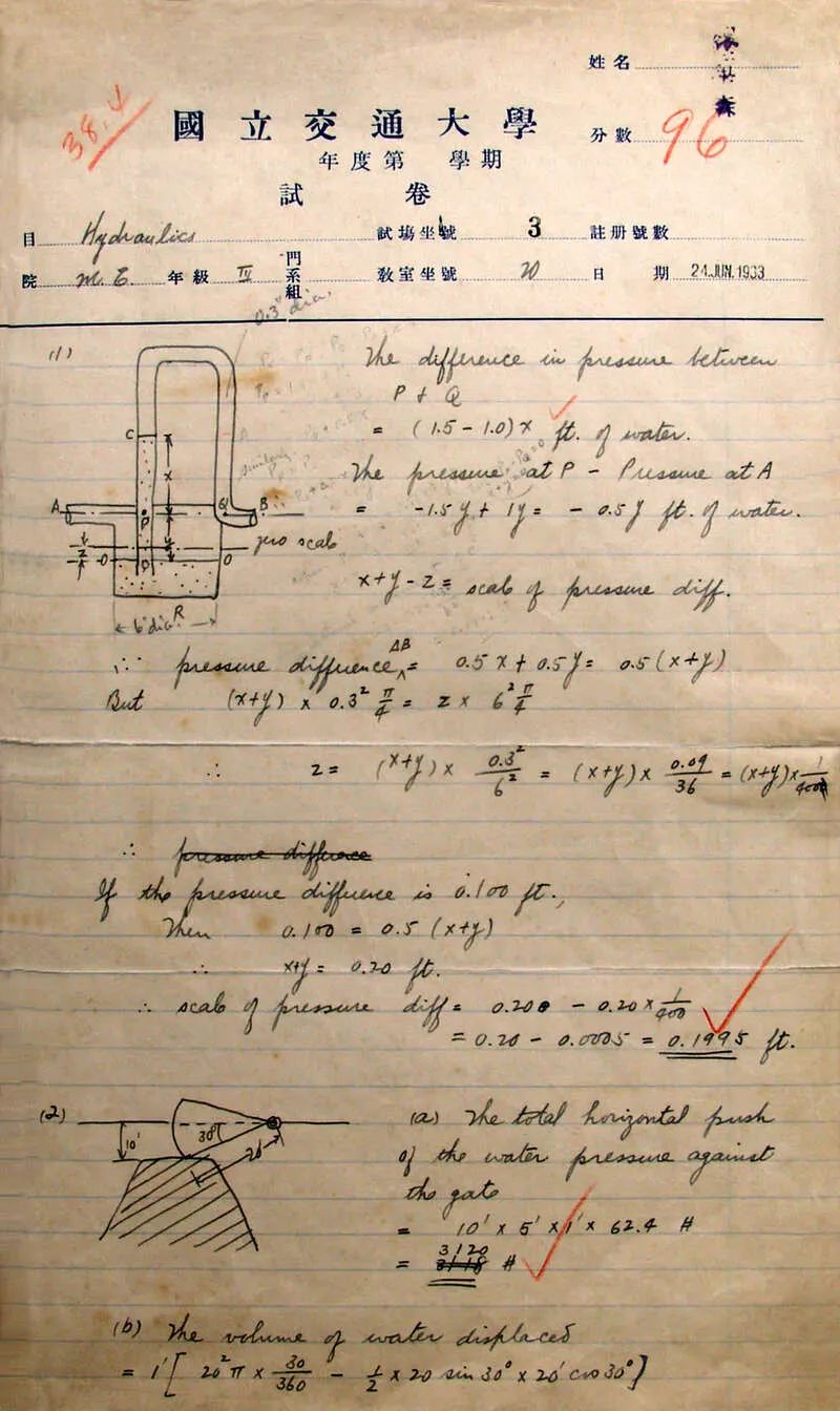 1980年,钱学森大学时期的水力学老师金悫将一份保存了近50年的考卷通过校史研究人员陈贻芳捐给了上海交通大学。这份试卷的卷首时间为1933年6月,课程是水力学(Hydraulics)。这份考卷书写工整,整洁漂亮,连等号“=”都像是用直尺画的一样,中英文字写得秀丽端庄。
