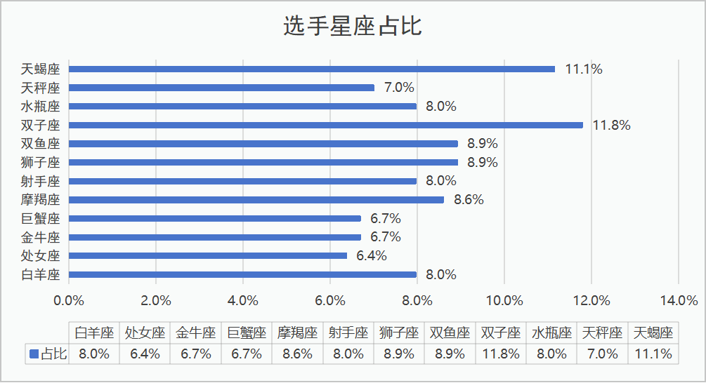 通过年龄和星座统计,我们发现25岁以下选手占比较多,天蝎座、双子座选手较多,占比超11%。但是,青春不分年龄,音乐不分星座!从“浴室歌王”到“舞台王者”,每一个你,都是我们寻找的“衢州新声”!